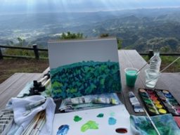 > こんにちは。メールありがとうございました。3時起きで鹿野山なんですね。写真を見ると、山の色が少しずつ黄色く秋めいていますね。このように遠くの方まで見渡せる場所で描くのは、とても気持ちが良さそうです。