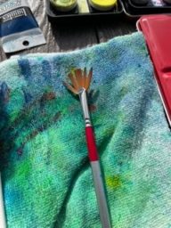 購入してそのままの絵筆。乾きの早いアクリル絵の具、それでも刷毛のような扇型の絵筆をその上から、勝手が違うと久留米に在住している吉武弘樹(芸大主席卒業、作品は台東区に飾られている。洋画壇の登竜門昭和会賞を受賞)さんに描きながらメールをすると以上のような返信。